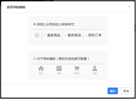 分别有类似微信自定义菜单类型、带购物车类型