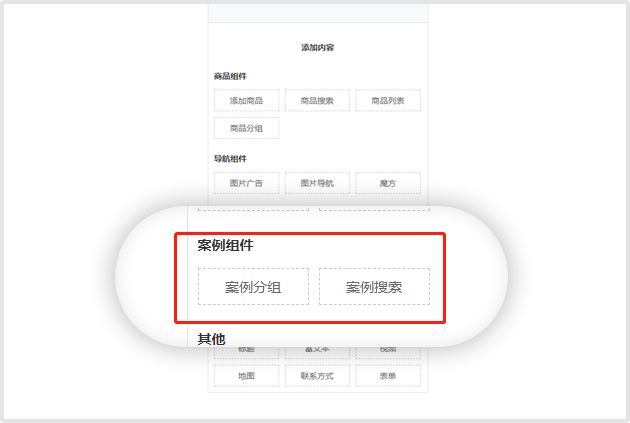 在底部组件添加栏中,我们也可以选择案例组件和案例搜索进行点击添加,但注意的是,这两个组件只适用于案例模板。
