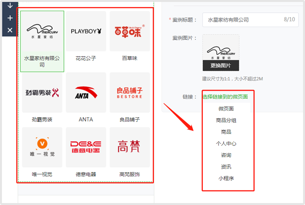 选择好带有案例的模版后,可对每个案例进行标题和图片的自定义,同时,添加链接,用户点击该案例图标,即可跳转到设定好的界面(例如可以添加该客户小程序商城的链接)。