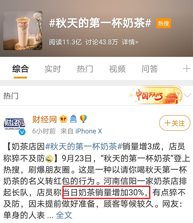 于是,秋天第一杯奶茶成了一种新的沟通交流方式,一时间火爆全网。