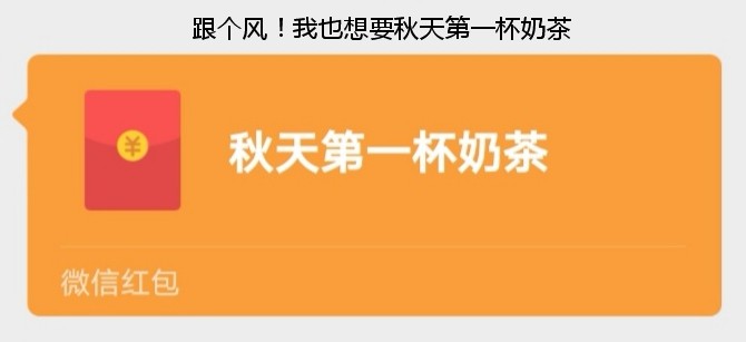 为了解释这个梗,特意去百度百科查了下它的释义:“秋天第一杯奶茶,网络热词,就是借着秋天的季节要了奶茶的红包,定义为秋天第一杯奶茶来秀恩爱。借指在要红包和奶茶秀恩爱或者秀感情。”