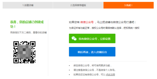 开店完成建议绑定微信公众号,但也可马上装修店铺,后期再进行绑定;同时,可扫描您的店铺二维码,在手机上预览您的店铺。