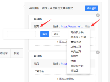 点击导航名称,此时可以输入新的名称;点击“修改”可以选择此导航链接的模块。