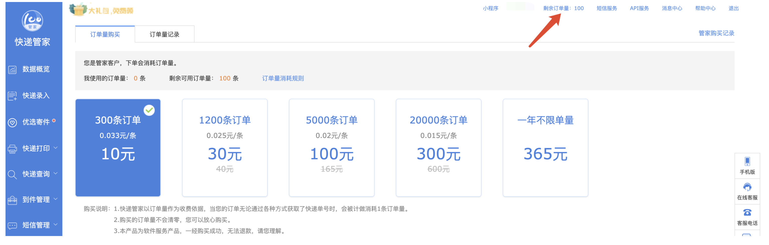 第五歩:进入服务页面,点击剩余订单量,如果剩余订单量为0将无法导入订单同步。建议购买1年不限量套餐。如果有可用订单量,可先进行测试,稍后购买。