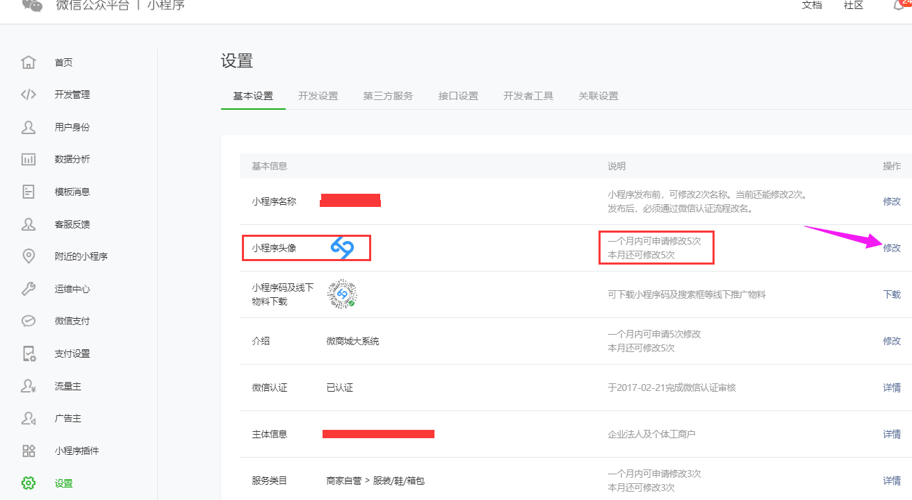 2、登陆后,点击左侧栏设置-基本设置-小程序头像